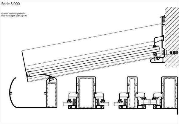 Die Serie S3000 wurde speziell für Terrassenüberdachungen und Carports aus ungedämmten Profilen (Kaltsystem) entwickelt. Alle Dachformen und Typen können hiermit realisiert werden. Die Merkmale des drehbaren Wandanschlusses wurden von der innovativen Serie 1000 übernommen. Dieses Dach-System wird auch bei nicht isolierten Sommergärten genutzt. Vorteile